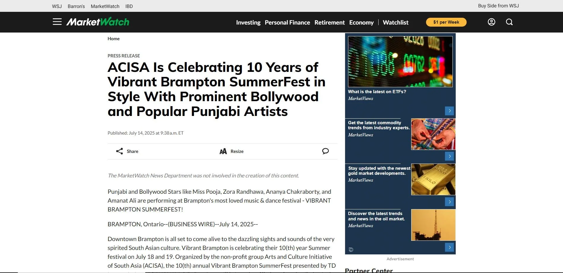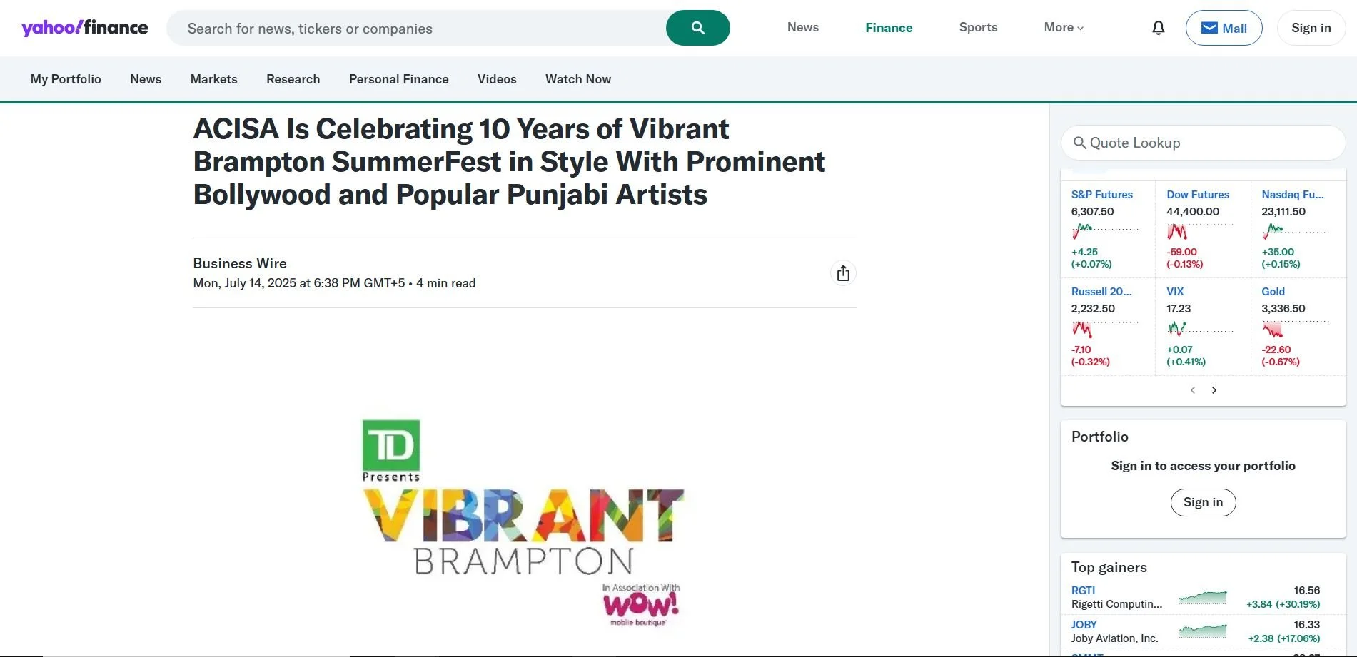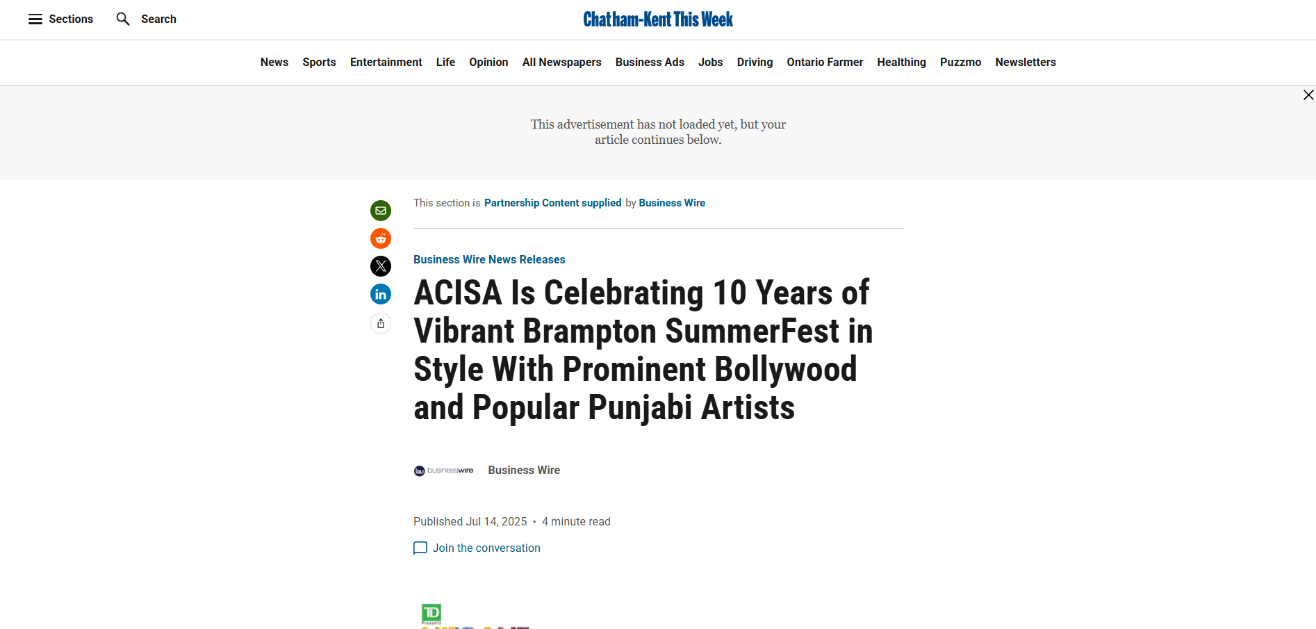Here are a few earned media coverage clippings for Vibrant Brampton 2025 - Presented by TD in association with WOW! Mobile.